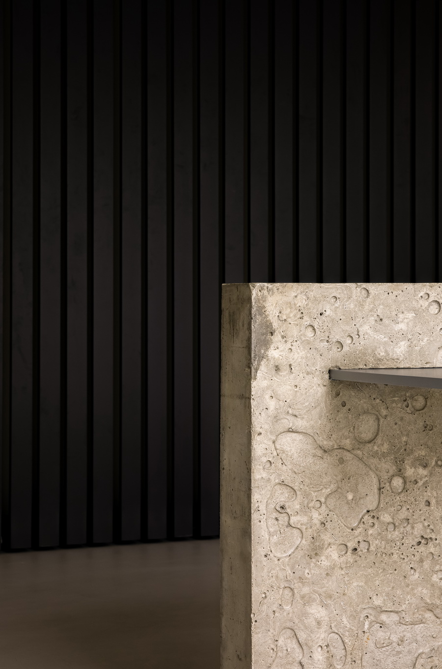 去接待台的设计也是我们在商业领域的一次大胆的尝试,而这样的尝试也是因为当代商业的收银方式在产生变化。空间中无装饰性软装的处理手法更是一个大胆的尝试,我们试图让人更多的去感受空间/材料与灯光带来的情绪,接待区唯一的家具采用混凝土与模拟铝材的漆进行碰撞,更好的让人感受材料本身的灵活性。