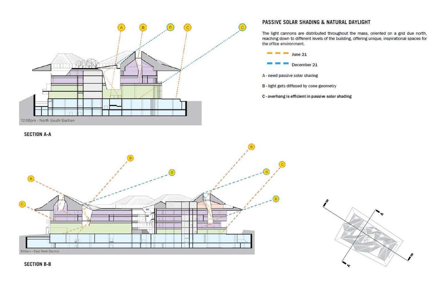 节能屋顶:展厅采用的双层屋顶避免了额外能量的散失。而造型突出的大型屋顶延伸悬挑则对整个建筑立面产生积极的遮阳效果。八个“光炮”更是将自然光照完全引入空间内部。该项目基于精密的光学研究,针对一天中的不同时段和一年中的不同时日都定制了最佳的采光和遮阳策略,加上地热热泵系统的配合,整个展厅的能量消耗比同类型的建筑要低30%左右。