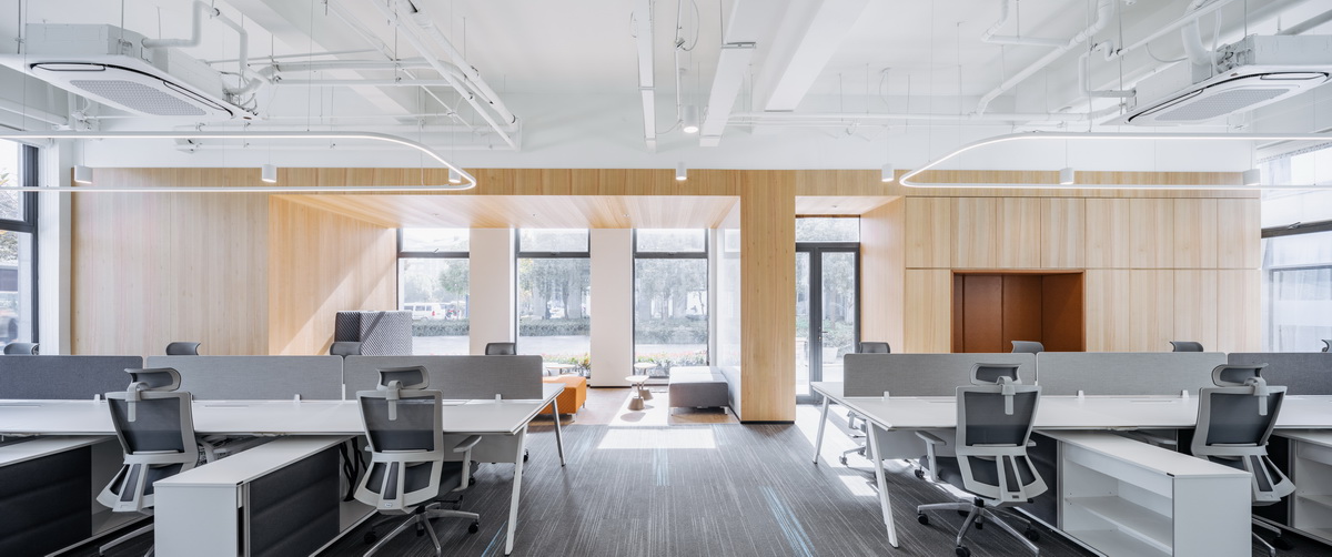 有别于6号楼极具仪式感的设计策略,8号楼本身就是被钢筋混凝土包裹着的各种精密设备和仪器,我们需要添加温度和活力,给在此长时间工作的科学家更多的自由自在。首层的开放办公,我们的目标是打破传统强排式的工位区,激活空间的使用活力值。我们把不同规格的会议室,开敞的茶水间以及配有沙发组合的开放讨论区分散在空间中,以满足科学家不需要长时间依赖固定工位,而需要随时小组讨论的工作模式。