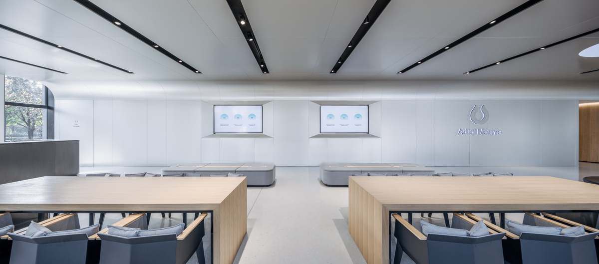 一系列定制家具的布置,提供了迎宾、接待、洽谈和展示的多重功能。除了大吧台,所有的定制家具都可以移动,为了满足企业发布会和内部团建的需求。它不是传统意义的企业大堂,没有咄咄逼人的前台,取而代之是一连串水滴造型的聚落,配以绿植,让人能安心而自由的落座。它也不是习以为常的企业展厅,摒弃了冗长且华而不实的企业展示,非常克制的布置了两个超大尺寸的显示屏。