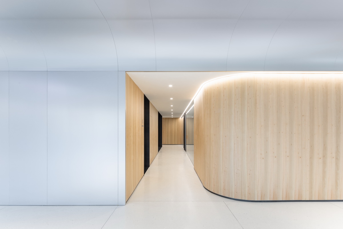杉纹尤加利以优雅的圆角给空间带来温度,平行的内凹灯带如行星轨道引导进入相对私密的细胞空间。开敞通透的会议空间,内嵌开放的茶水吧,暗门背后的禅意茶室与拥有温暖壁炉的贵宾接待,是仪式感背后的精致美学。位于入口处的黑色圆盘装置,与天花的白光圆形顶膜,代表原力的黑白二重性,以一种抽象的极简美学展示企业的精神内核。