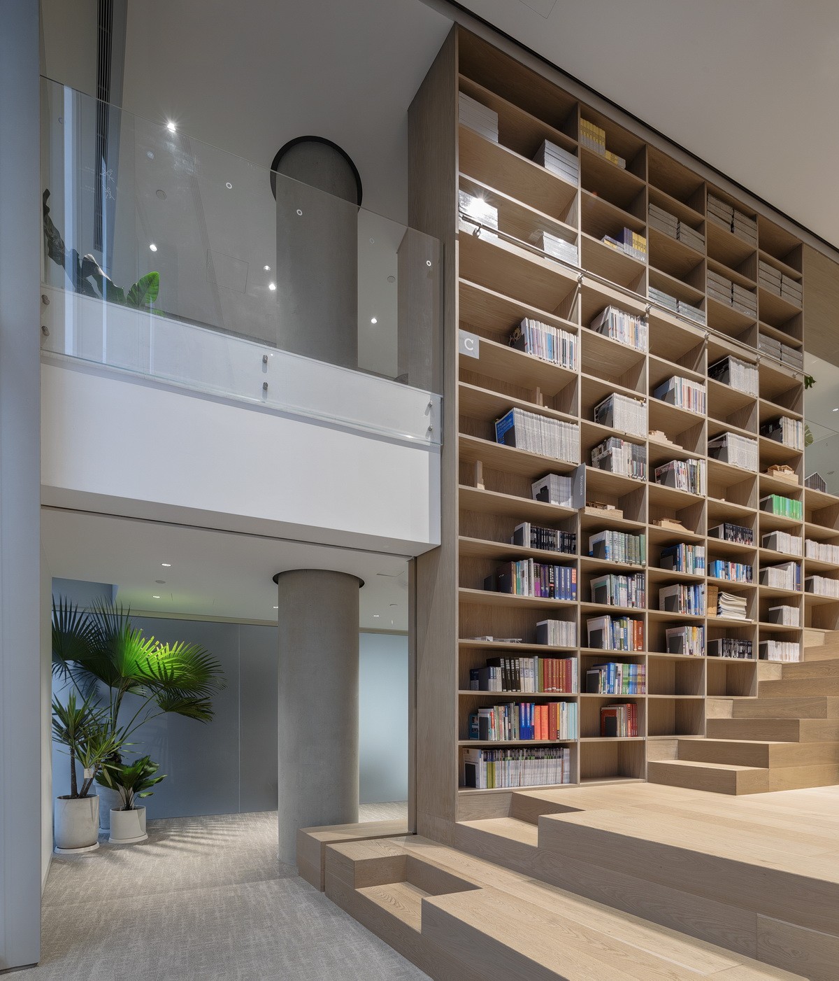 从三层至七层,两座通高中庭将所有开放式办公区域联系起来,形成了一座垂直的阶梯图书馆,多样化的使用场景也让这里成为一座自由的学校。