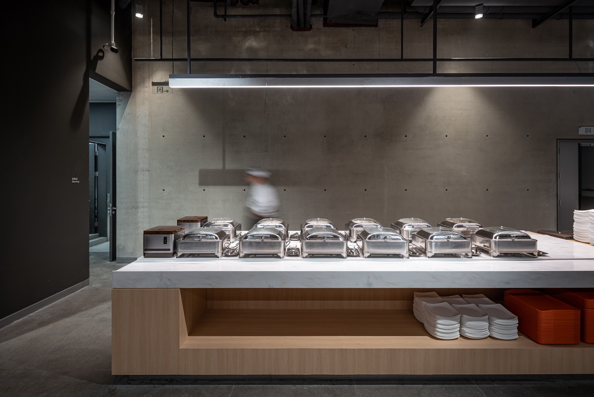 属于设计师的餐厅是怎样的?这里也许给出了理想的答案。虽然位于建筑的负一层,但是下沉庭院却提供了富有魅力就餐环境——充足的阳光和枯山水景观面向餐厅展开,透过透明的界面带给用餐者美好的用餐体验。枯山水景观来自日本枯山水设计大师枡野俊明。