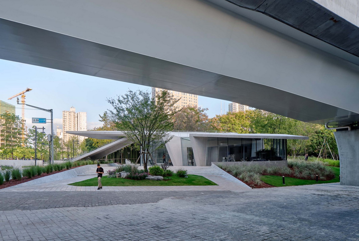 纸鸢屋的功能空间根据建筑的形态被明确划分,西侧保留了之前管理用房的办公功能;辅助功能,比如卫生间以及设备用房被安置在建筑的中间部位;最大悬挑折板下的空间是建筑的主体空间,由玻璃幕墙围合而成,是市民的活动休憩空间,同时兼做九子活动开幕的组织房间。