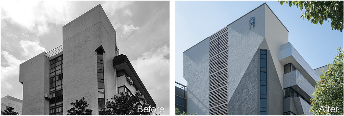 现场考察时,我们还有一个特别的发现,因为既存建筑的围合布局,当阳光以不同角度照入时,会在建筑外墙上形成不同尺度的三角形阴影。利用这一点,我们通过设计,使得正午时阳光的阴影,与立面上设计放大后的三角形体块交错,形成了新的等腰三角形。既丰富了立面效果,也使得园区更具趣味性。