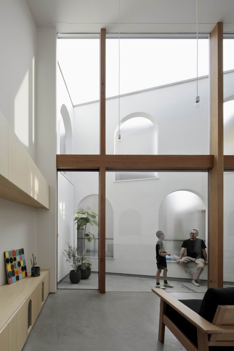 一系列拱形开口布置在房屋内外的不同位置,将室内外空间模糊处理。在开放式起居和用餐空间,后院之间以及房间之间的边界都采用了这样的手法,这样的设计创造了多种有趣的光线、和居住空间,同时延展了视野和内部空间,如同在城镇中漫步。