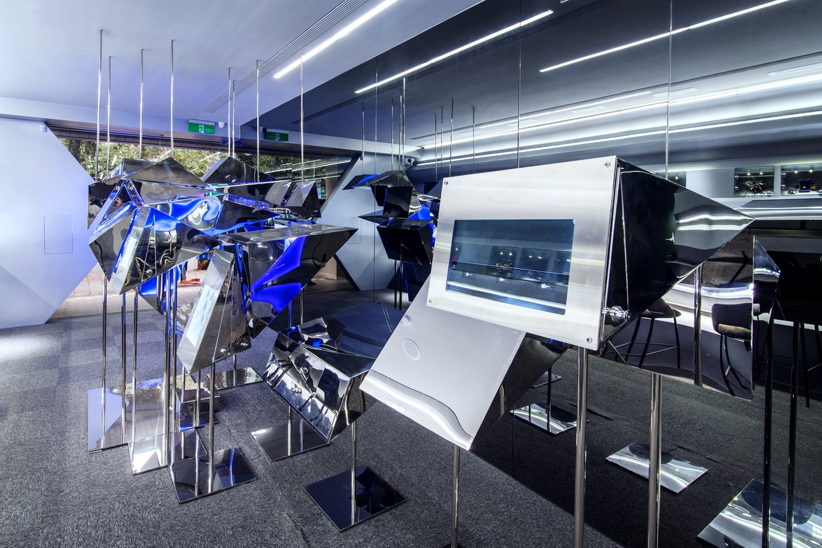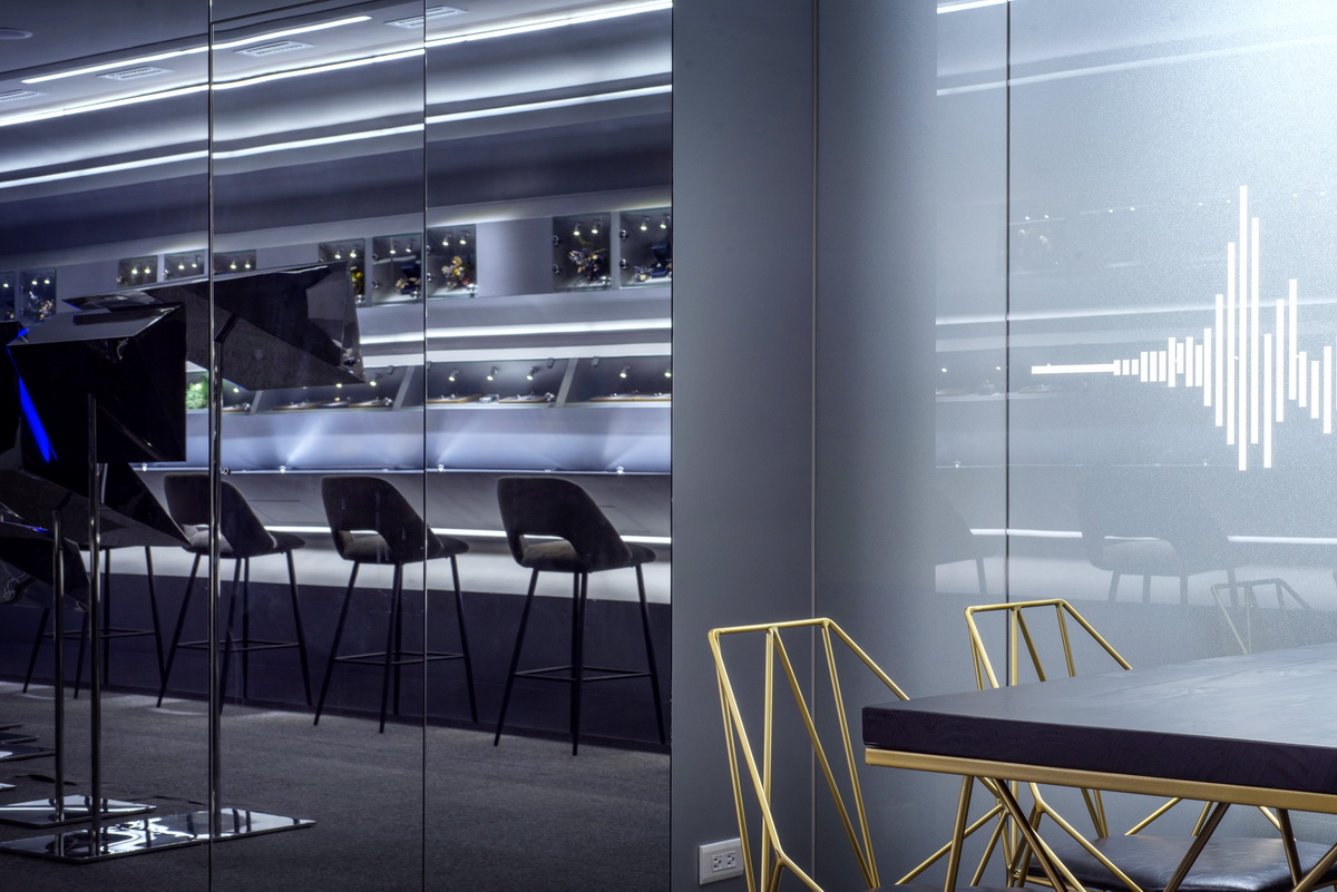 镜面与不锈钢材质的包裹,延伸的展柜,让顾客穿行其中,沿狭长空间的行走动线设计出现面向不同角度的独立展柜,在光线的各种反射之下,步移景异。