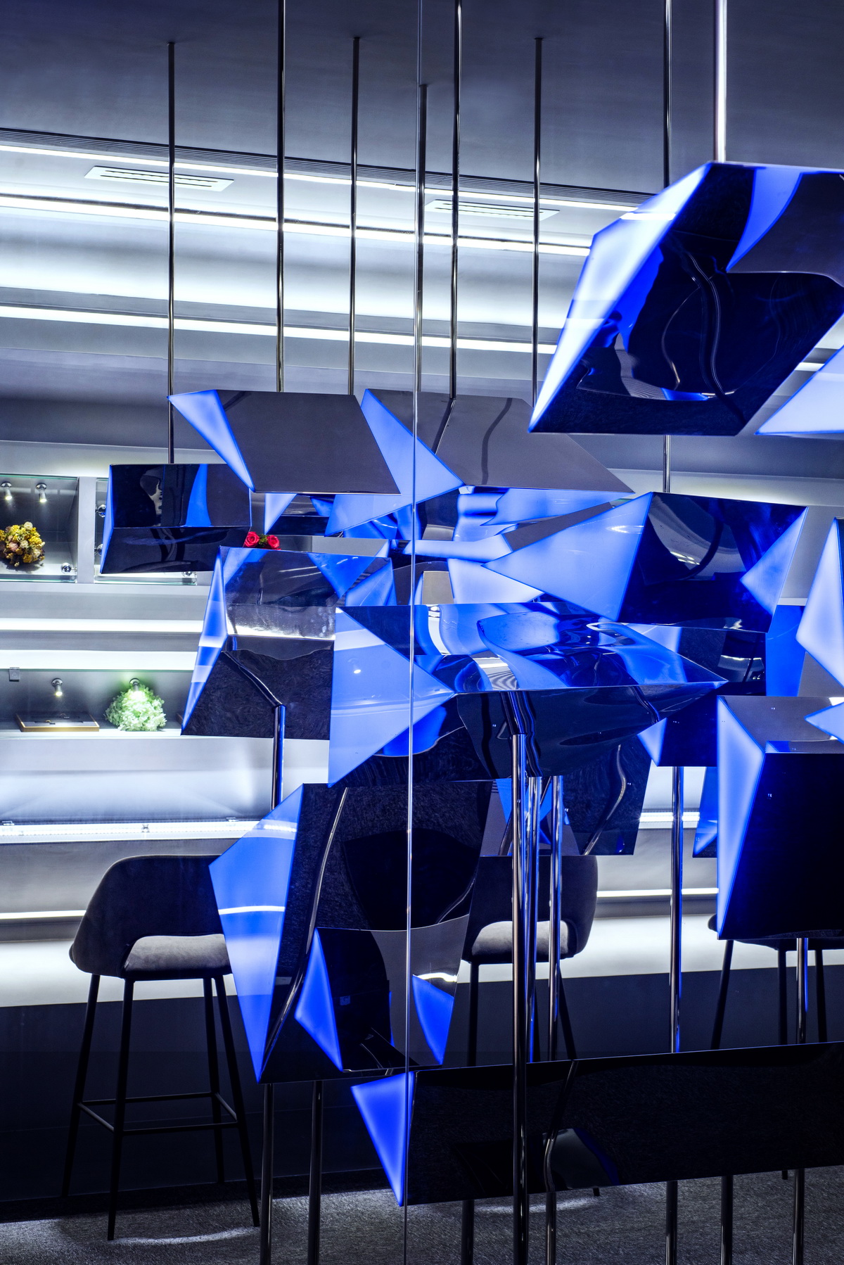 全店以灰色与蓝色创造平衡,耕植品牌本身的形象,蕴酿出钻石背后,关于爱的多面情感。