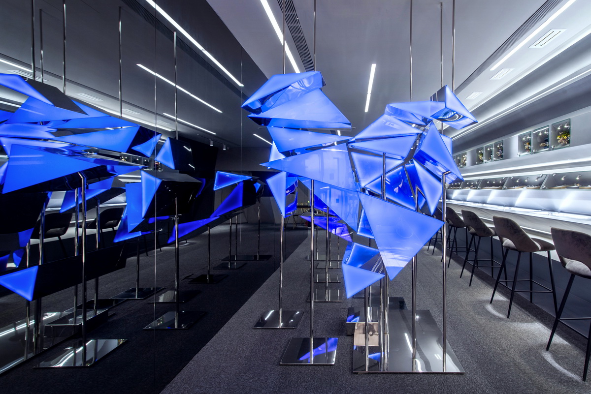 中心的蓝色爱心装置是空间中匠心的开始,以银色拉丝不锈钢材质作为包裹,不规则的造型组合成心的形状,并随着体验者位置与视角的移动,产生不同空间画面。在不同空间层次的形态语言中,蓝色爱心在纯净的银色空间基调中愈发夺目,隐约之间折射光芒;线性灯带延伸空间,使视觉界面无限蔓延;用一颗浮夸的心形语言点亮整个灰空间,以定格的即将爆炸的心形表现动感,配以深色的家具陈列细节,让空间聚焦于中央心形装置,每个展柜都等待着顾客采撷其最动人的一面。