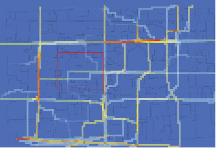 其次,基于以上规则,同时模拟多人在古城中的移动,将移动轨迹生成热力图以推导街道的使用频率,并总结出场地周边的行人流线特征,以作为规划场地内部动线的依据。