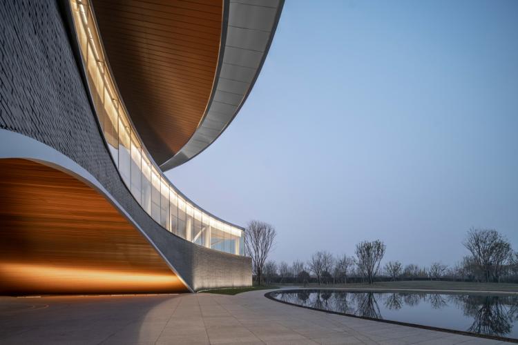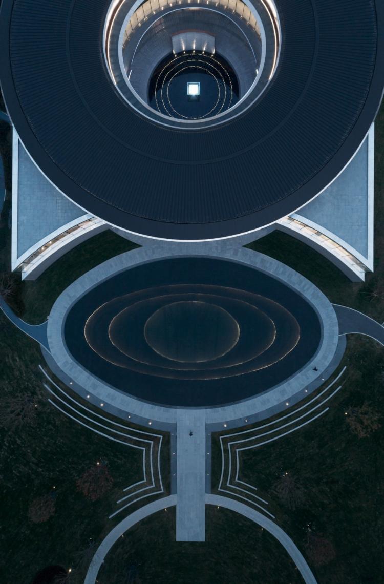 设计希望能体现建筑与中国传统宇宙观的关系,最终提炼出形式上的“三道弧、两个口与一束光”。时间和空间已在第一道穹宇之弧和第二道四方之弧之间形成,第三道入口之弧则是整个立面形式序列的中心焦点。当建筑倒影于水面之上,虚实相间的两道弧线形成了一只眼睛,而通过这只眼睛仿佛望向时间与空间转换的交汇之处。