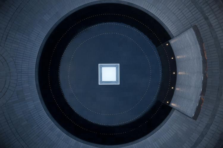 整个建筑有两个开口,一个朝向西侧的花园,另外一个朝向天空。入口引导行人的汇聚,朝向天空给人予仰望与反思。建筑内部的圆形空间,取意于中国传统建筑中的“庭”与“院”的概念,庭院连通天地,有别于外部与室内空间,为建筑空间打开了另一个维度,时空在此交融。