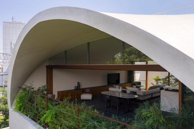 为了使自然光能照射进森林,我们对建筑物的边缘进行了圆角处理。结果,建筑物的室内变成了一个类似洞穴的空间,它包围着你,填满了空间,让空间充满安全感。从技术上讲,圆角形状提高了天空的可视率,减少了从前方道路往上看时,建筑物的威吓感。