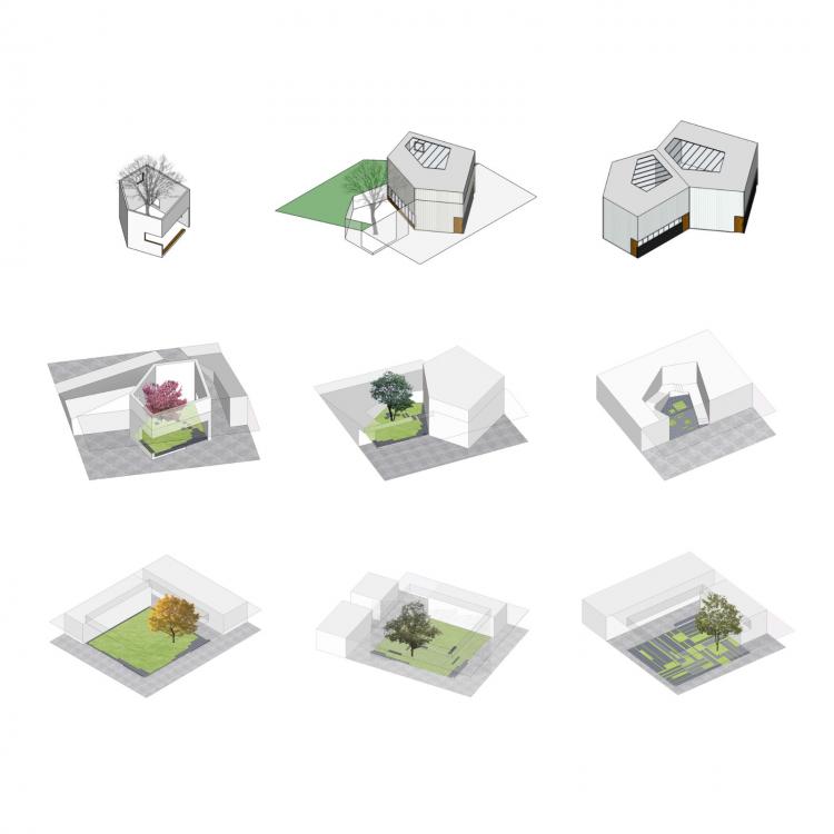 五边形音乐教室和德育展厅作为特定教学空间,层高高于普通教室,同时设置天窗。音乐教室为两个五边形教室组合,德育展厅则为五边形教室+五边形庭院组合。