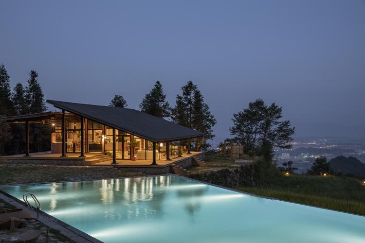 室外泳池是在原场地鱼塘的基址上改造而成的。这样的处理既减少了土方量,又让改造前后的图景形成了戏剧性张力。当今,无边泳池已是高端民宿的标配,建筑师希望创造一个“稻田中”的无边泳池。随着后续农业景观的完善,泳池将与稻田更紧密的结合,闻着稻香,手可触及到稻穗的游泳体验,想来还是很浪漫的。