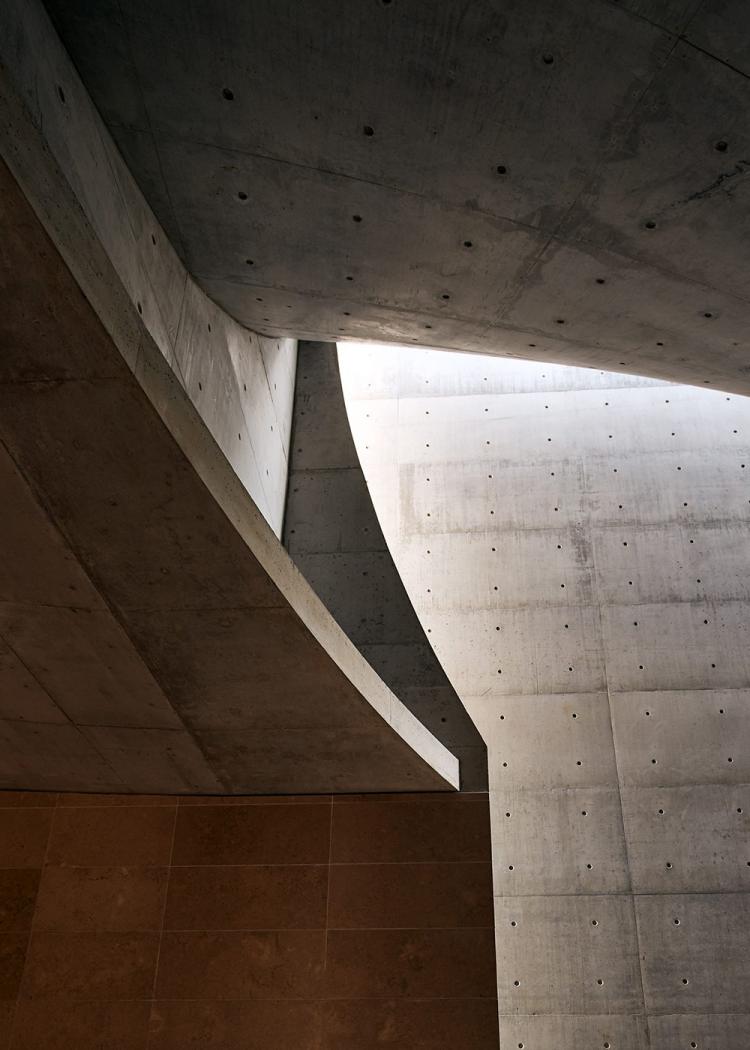 Burns选择可塑性较强的混凝土作为“小教堂和冥想室”的主要材料,以实现连续弯曲的教堂形态。这种材料也创造了教堂“中性的、内外一致的”色调,以保持对景观的呼应。