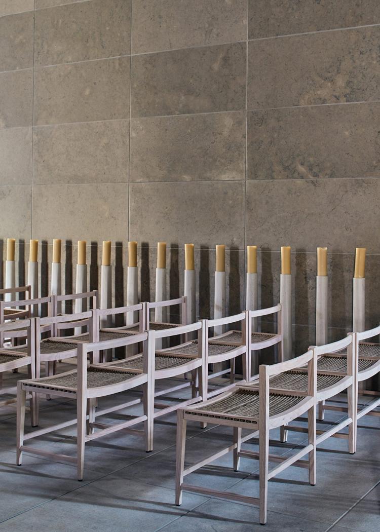 教堂内部配有极简主义家具,包括由Burns的工作室设计的轻质木椅和由其儿子手工打磨的中堂内的石头烛台。