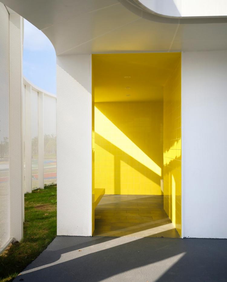 本项目位于杭州市临平体育公园,旨在为市民提供公共服务设施以及休憩空间。体育公园是高密度城市中难得的以生态乐跑为主题的大型开放公园。在这里,多彩流动的跑道与自由开放的大草坪形成了公园简约大气的景观特征。