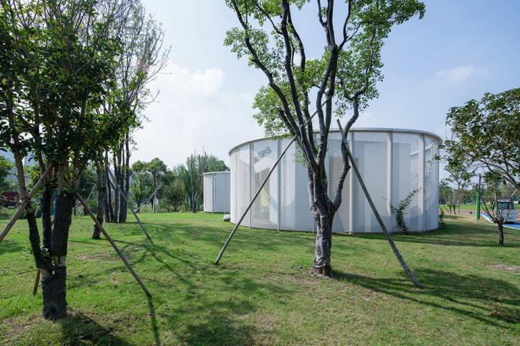 在设计中,我们用半透明的白色金属网在场地上围合出一片区域,形成一个与自然透而不连、尺度适宜的庇护空间,随后我们将休息驿站的功能化整为零,打散为男卫、女卫、第三卫生间三个主要建筑体量,将它们置入空间中。