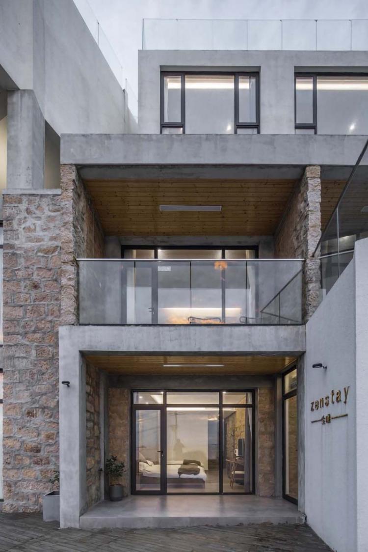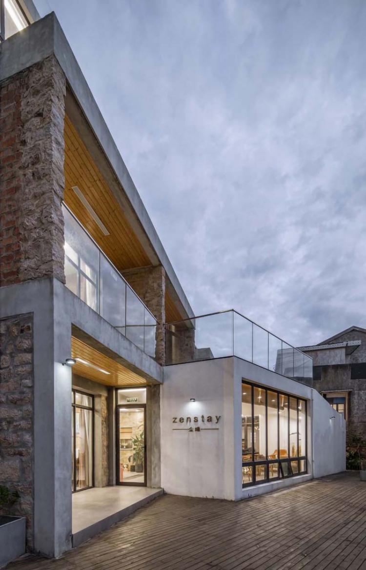 本案最大程度地保留了老建筑的石墙、木楼板和木屋架、灰瓦的坡屋顶,营造朴素原生的居住空间。同时,在一层入口插入白色体块,使原本分离的公共空间串联而具有纵深感;在大堂中央设置室外中庭,调节采光和气氛;通过框架结构,在三层架空多个白色体块,并对应景观使其方向做了扭转变化;三层以上形成屋顶平台,以满足无边泡池、露天剧场、聚会空间等配套功能。