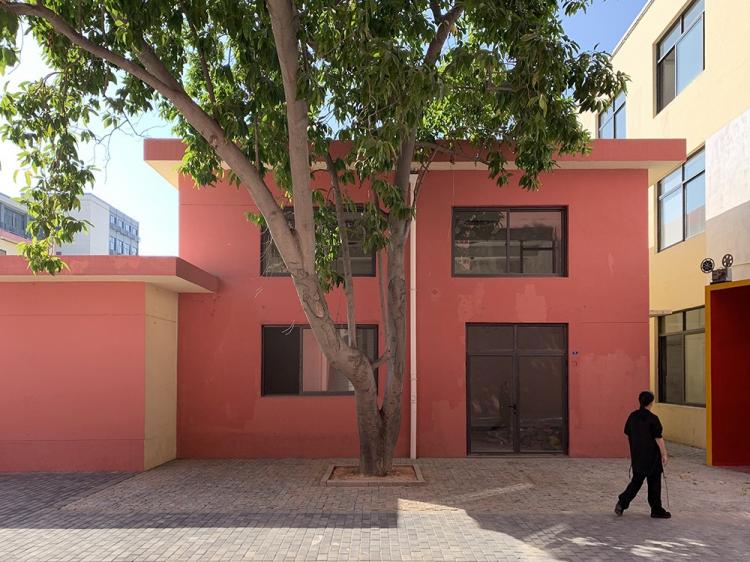 随后,我们对建筑外部进行整理与简化,将部分体量做实。建筑外部使用了与内部相同的檀黄色涂料,特殊的墙面肌理由工人师傅手工反复涂抹形成,原本立面语言相异的三栋建筑由此和谐交融。远眺而望,一棵高大繁密的玉兰树占据了视觉中心,建筑形体在树冠的掩映下消隐了边缘,变得隐忍克制,似有还无。