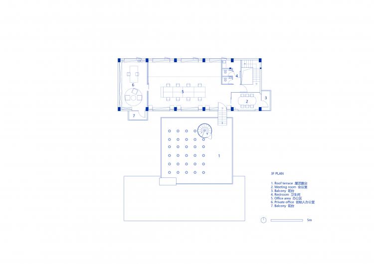 露台的一角新设了一段室外直梯,用以连接2号楼和3号楼办公区。为了提升办公区的空间感和通透感,我们拆除了原本厚重的电梯井墙体,并在楼梯间顶部增设了天窗。从垂直的、光影变幻的楼梯间拾级而下,便可到达办公楼一、二层的时装展厅和工作坊。