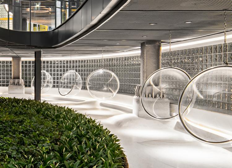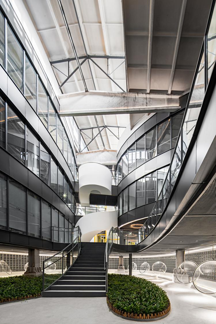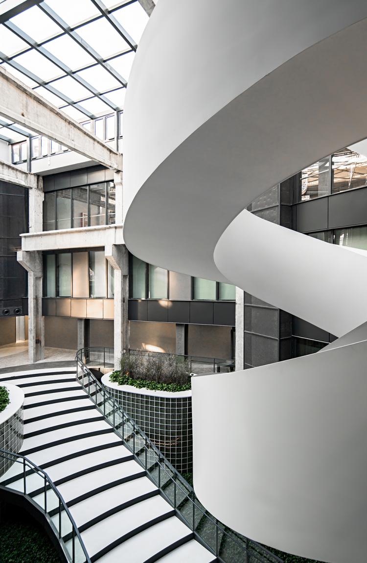 由于整个项目东西尺度较长,设计师在中庭间隔设计了两部不同形态的旋转楼梯分散组织人流动线,并起到活跃空间氛围的作用。