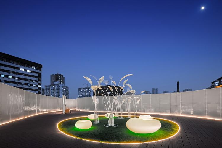 花园中心设计太阳能自发光座椅及叶片、羽毛形态的艺术装置,夜晚漫步时,互联网人的思绪也可以随时飞舞起来。