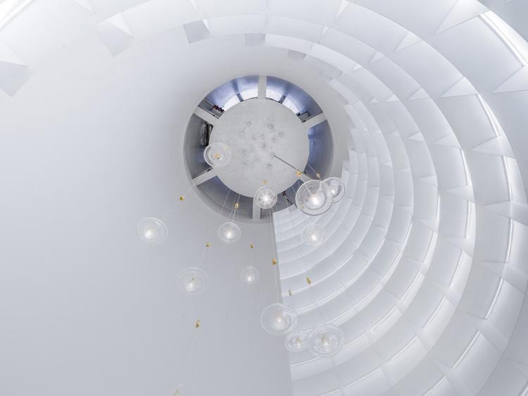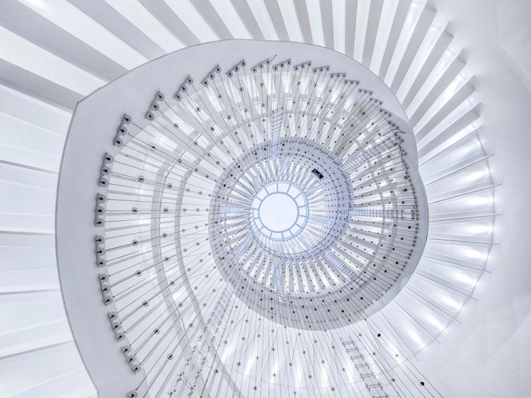 “筒”是对形状的描述。十个筒仓是十只直指天空、通向梦境的隧道。扎实而平行上升的 “文学仓”;呈阶梯上升的 “旅行主题仓”;浪漫而快速螺旋向上、无限延展的”诗歌塔“……当人们走入这个“圆”形筒底向上仰望的那一刻,便是连接了精神、书籍、自然、苍穹。圆形视角带给人的无限延伸感,与 “书”能将人引向无限精神空间的内涵恰好契合,“书仓”这一物质空间,变为精神空间。