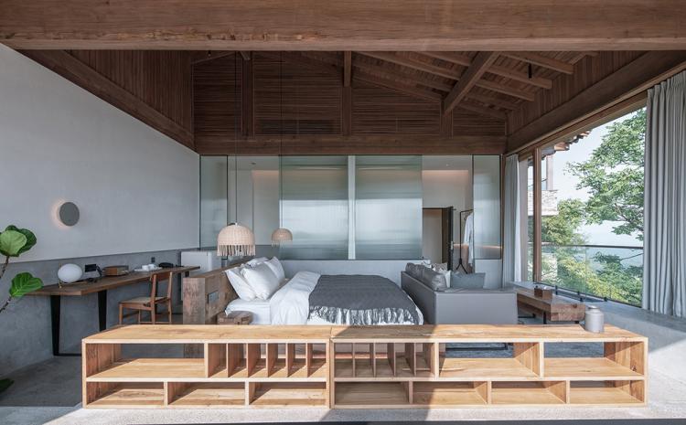 顶层是一个大套房,空间横向延展,从玄关转入便能看到连续的山景被引入室内,视野被完全打开,近处有部分树杈冒出,形成近景远景层次,坐在阳台,微风拂面,喝茶看山,非常舒适。套房的布局上以内天井和浴缸泡池为界分成两个区域,一半是睡觉喝茶区,一半是休闲水吧区,空间通透自由,屋顶木构梁架裸露,结构与空间的关系一目了然,清晨鸟叫声响起,打开窗帘便让人心旷神怡。