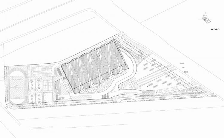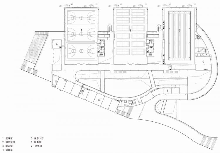 考虑到金阊新城体育馆不同于单职能建筑而呈现的多元综合、集约配置的特性,建筑师用一个整体化的建筑语言——统一的屋顶和基座平台,将零散的功能元素组织成具有规模性优势及整体性优势的空间集聚体。
