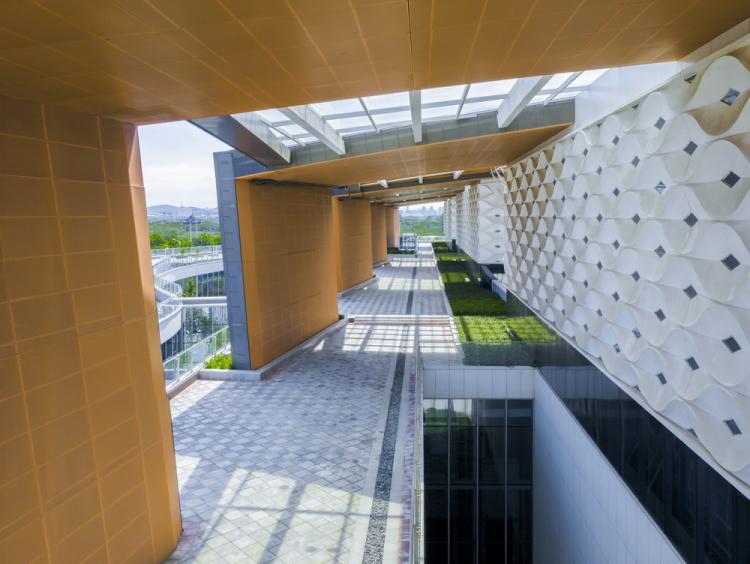 金阊新城体育馆与其东南方虎丘塔风景名胜遥相对望,是以在场地南侧设置相对静谧的观景平台。另有缓坡引导游人蜿蜒而上,好似虎丘山林小径曲折绵延。各观景平台高差分明,进退有序,每行至一处都可休憩身心,或远眺风景。