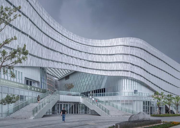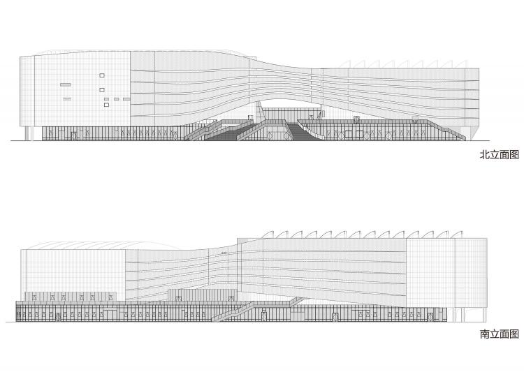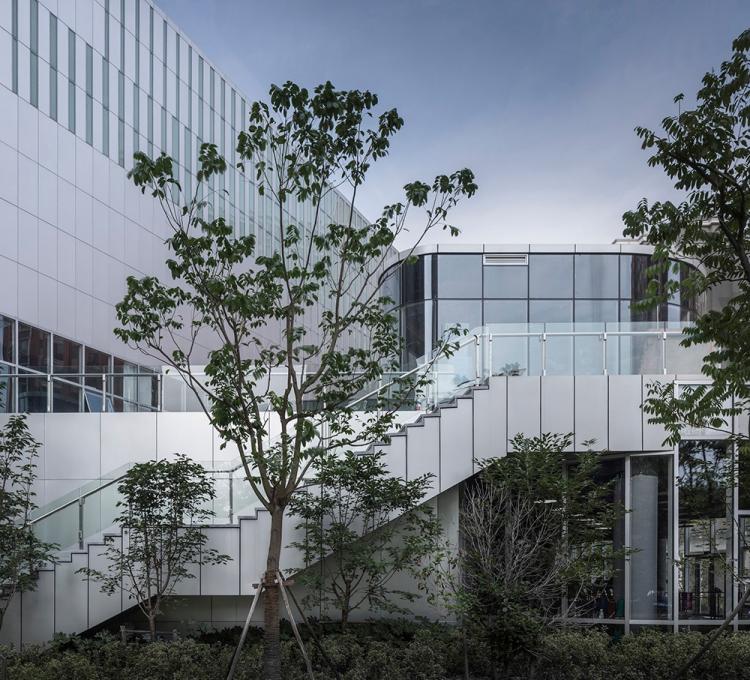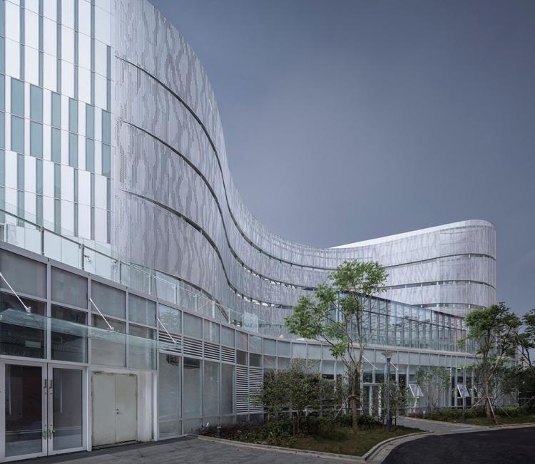 建筑师为这座文体中心设计了一层极具柔性、形似丝绸的外表皮,将两个相对独立的建筑单体包裹联结,并在中间聚合出公共开放空间。轻薄的金属穿孔板作为这层外表皮的主要材料,记叙着如今浒墅关经济开发区高歌猛进的时代性。柔韧的造型、细密而又轻薄的质感不难让人联想到闻名遐迩的浒墅关丝绸。现代性与在地性于此间寻求平衡,在城市文脉的彼此关照中成为可阅读、可识别的事物。