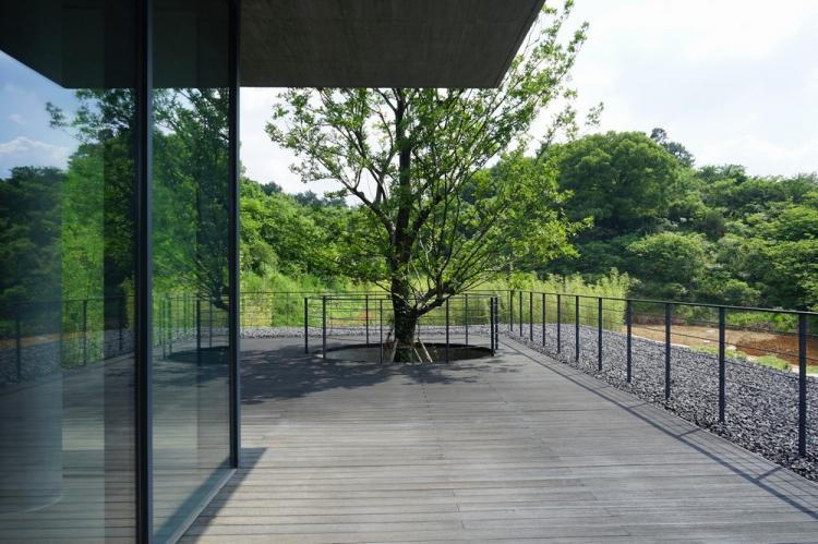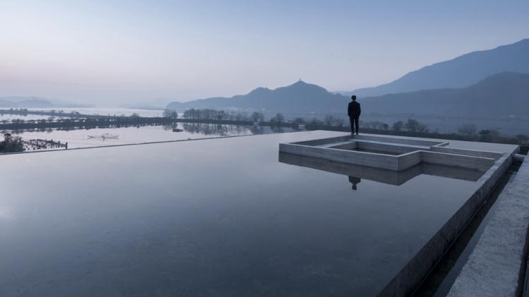 山水既是空间组织的起点,也是空间的有机组分。建筑依山面水,空间内的刻意留白营造出特殊的意境。连续的玻璃幕墙对内部空间产生限定,各个空间相互穿插,最终形成室内亦是室外的空间形态。