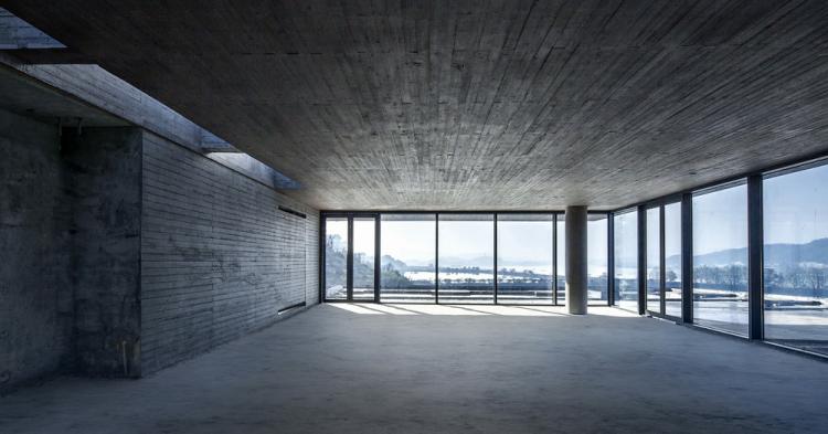 通过对地形的借用,接近完工的渔乡茶舍依偎在富春江畔的山坳中,薄而深远的挑板与粗粝厚重的混凝土产生的“薄”与“厚”的对比,在光影的调和下,已频频打动亲临现场的人们。