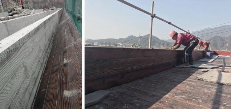 项目自设计以来历时近三年,设计工作贯穿着整个施工过程。建筑师希望在大尺度的山水环境中突出材料相对强烈的肌理感,在正式浇筑前,经过多次实验,选择了纹理较为清晰但成本并不高的碳化木板作为模板。为把控施工效果,最终采用的是同一模数错缝拼装的折中模板方案。