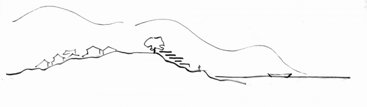 基地在一个山坳中,直面的便是天水一线、波光浩渺的三江口风光,江水、云影、延绵山势和远处隐约可见的村落构成了一副气韵生动的水墨画。