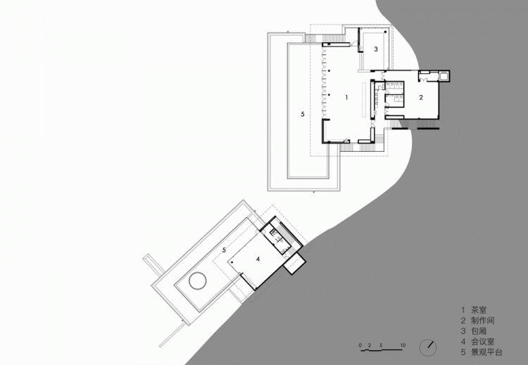 临江的主楼与坡上的次楼分别留有洞口,并引入植株作为入口提示。这样“双入口”的设计也是建筑师在业主功能不明确的情况下的灵活性应对策略。坡上入口做圆形院子,并通过片墙延伸,将空间蔓延至周边,模糊了建筑与自然的边界。