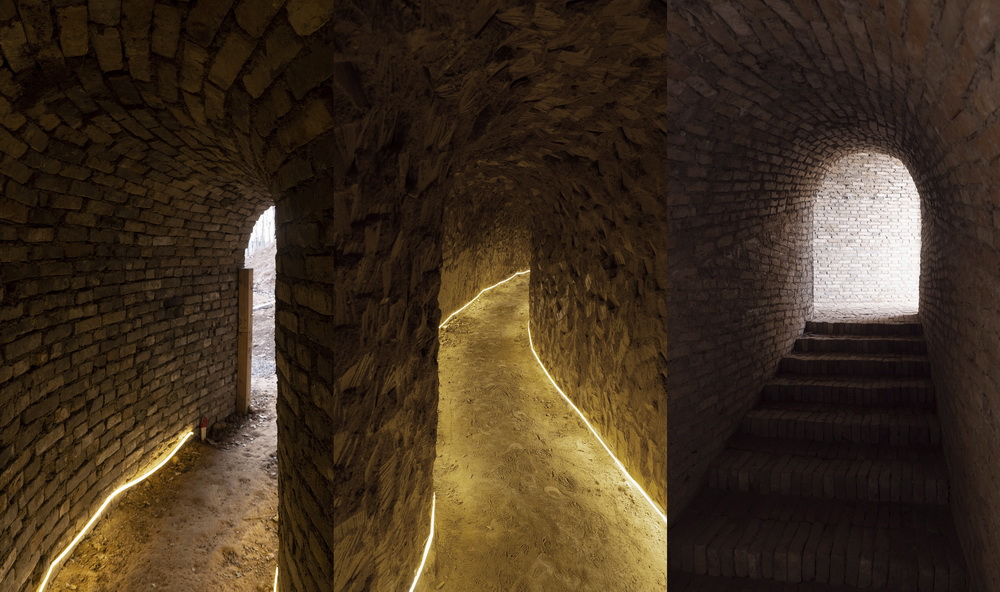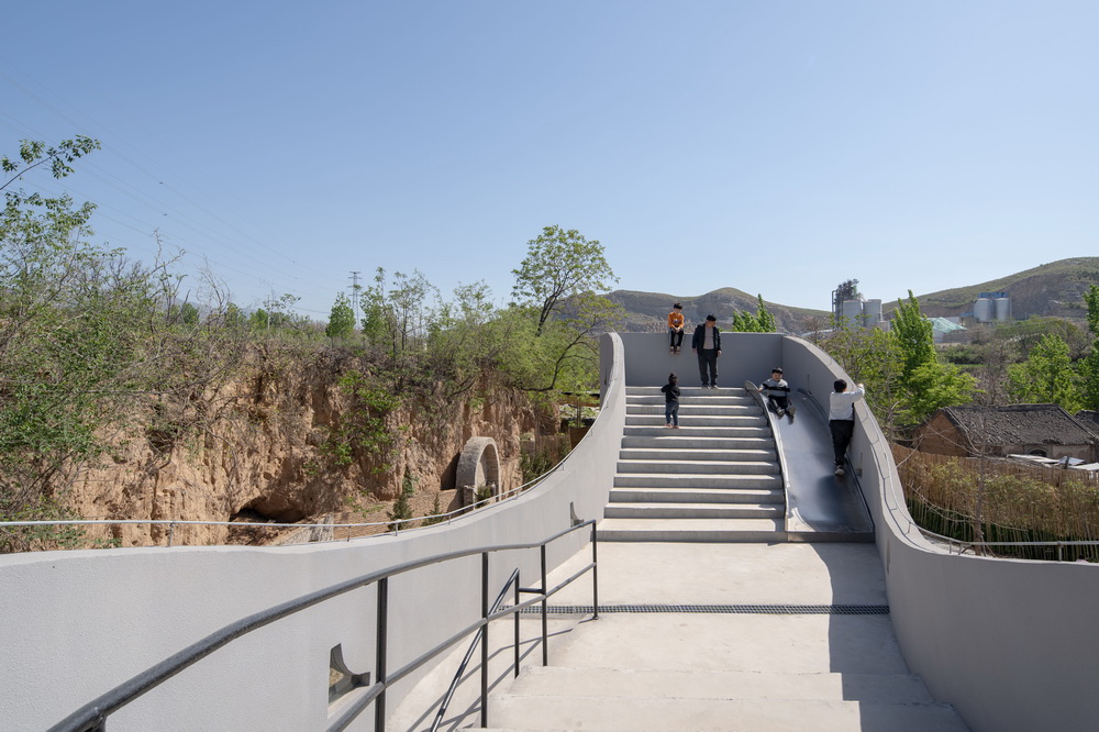室内作为一个可以兼做小型论坛放映室的阶梯图书馆。建筑蜿蜒的平面及周边路径则成为周遭迷宫般窑洞系统的延伸。