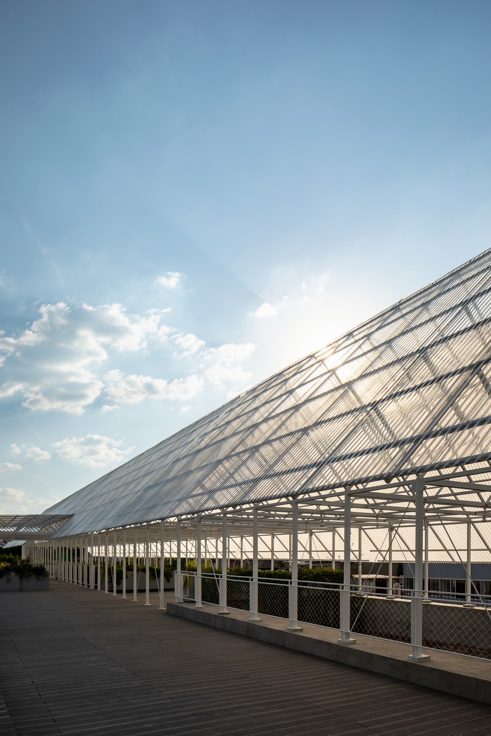 该结构由 45 个轻质金属桁架组成,每个桁架相距 1.2 m,将重量平均分配到现有结构上,并突出屋顶的韵律和透视感。