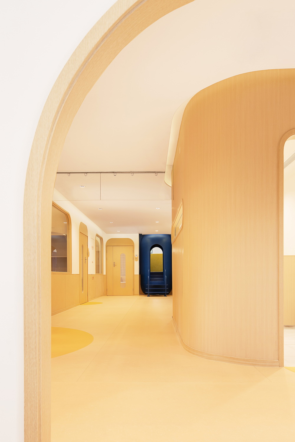 入口避开了园区内的公共道路,隐藏在一排绿植木墙之中,形成了内与外的分界线。线内的区域以浅色木纹为基调,圆拱、圆槽、圆角形态,被使用在门、墙壁、前台。木质对抗水泥,柔和的形体对抗坚硬的直角与漫长无边的直线。可感知的质感,描绘出通往儿童行动与体验世界的地图。