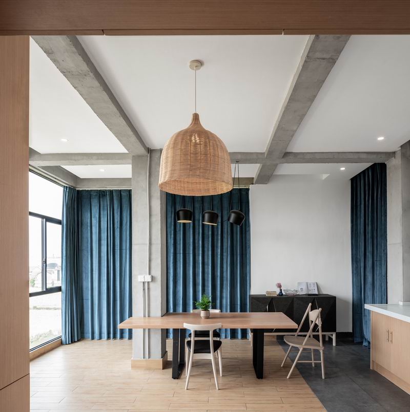 建筑的四层北侧设计了一个套间,沙发床、厨房、起居室以及简餐厅都整合在一个大空间中,房间设置了最大化的落地窗无限接近稻田风景。开放复合的空间布局很符合年轻人的生活方式,每逢节假日,在外工作的年轻人返乡,家人齐聚一堂,这里是最好的家庭聚会地点,也是小朋友绝佳的玩耍场所。