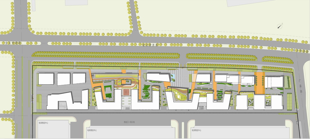 品牌形象:在设计生成过程中,本项目根据狭长用地的特点,形成四个主题空间,并在中部形成内街,将主题空间有效串联。四个主题空间充分体现了菜鸟及阿里巴巴的品牌特点,并切实为电商服务,承载了庆典、集散、展销活动、商业配套、电商网络交流、电商休闲生活等众多功能,形成复合的社区。规划布局考虑到菜鸟及阿里集团开放高效的企业文化,所有活力空间面向城市界面展开,呈现开放的姿态。