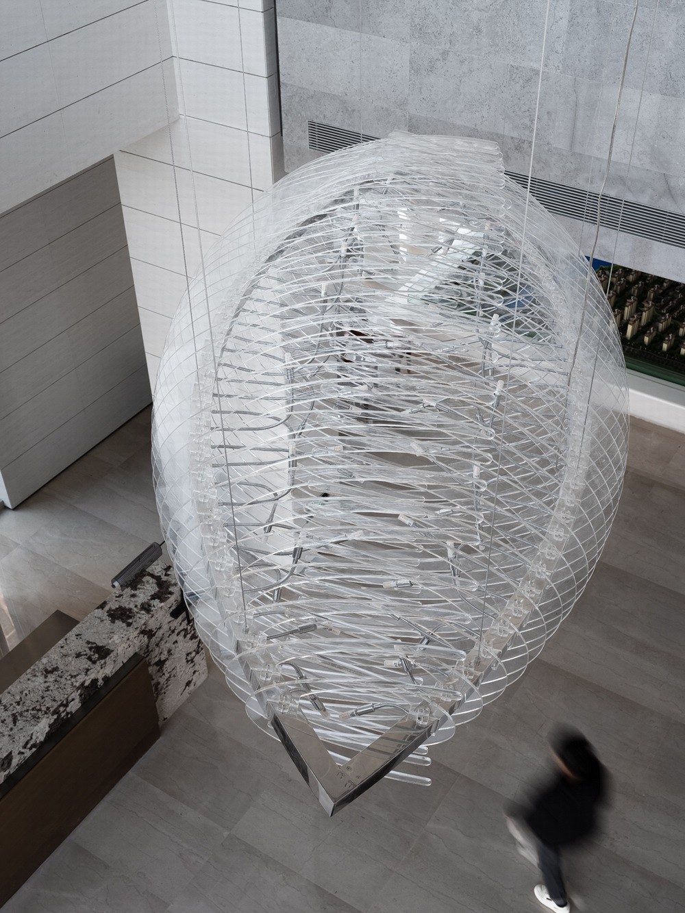天花利用不锈钢镜面与时时变化的光线互动,表现出“水”一般的形态。艺术装置和沙盘模型的形制灵感都来自“帆”的造型,让美感与“启航”般积极上扬的气息兼具。