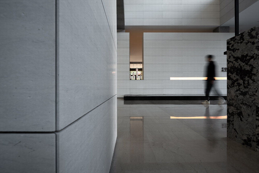 带有大胆纹路和强烈肌理感的石材在空间中或大面积伸展膨胀,直观地激发起人们对自然的联想;或局部点睛,活跃视觉节奏。整体间续贯穿后,给予空间沉稳又强势的张力。