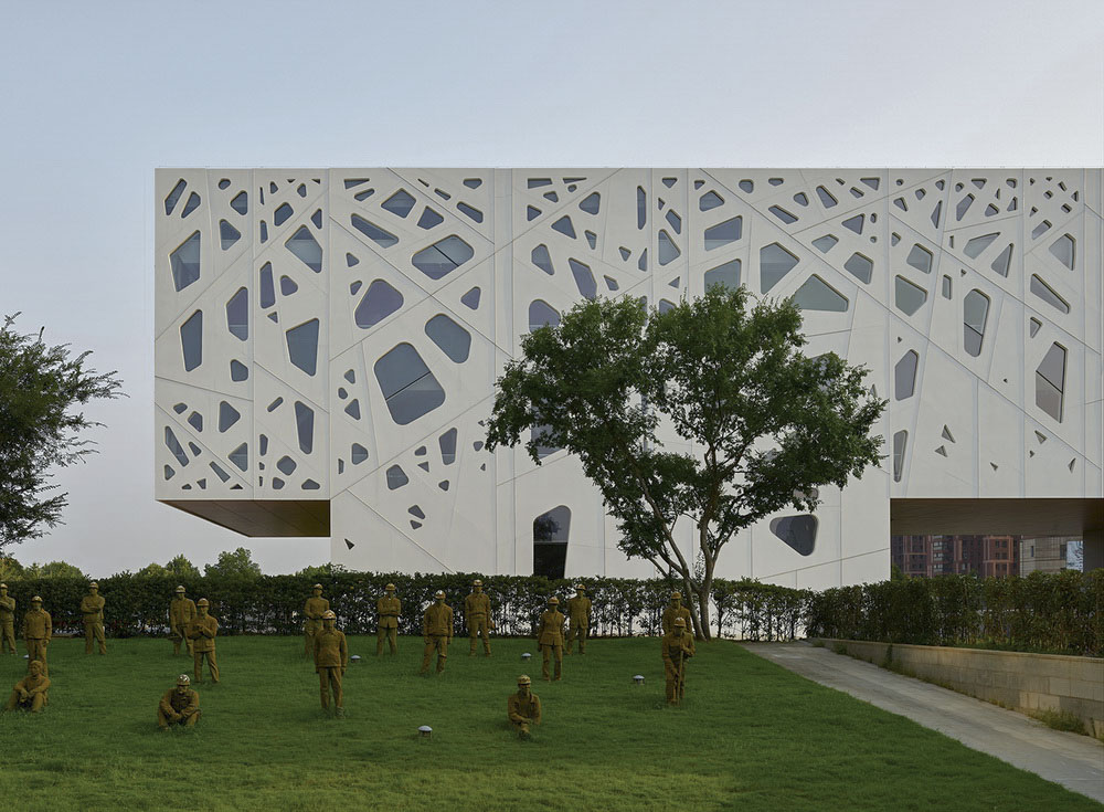 在这个大格局中,中环艺术沙龙作为本项目一期于2009年(十年前)落成并投入使用。其后院绿坡上伫立着以参与此项目的建筑工人为原型的真人尺度雕塑,在新落成的艺术馆背景的映衬下,以艺术的形式和语言致敬着普通劳动者。