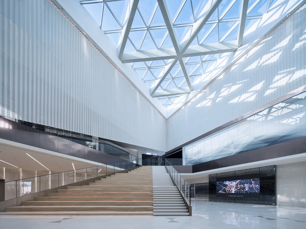 采筑展厅的空间设计延续了建筑设计的特点,以科技联动、阳光生态为主线,通过结合细纱的触感和反重力的视觉感知呈现,将富有金属感与科技感的冲孔金属板以垂吊的形态围绕中庭进行设置,呈现了数据时代的信息流的重要性,同时也赋予空间新“未来”的活力与思考。