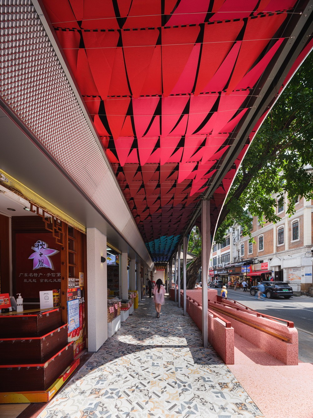 此次更新中,我们采用对比的设计策略来向原有厚重的文化致敬,用神似替代形似,并未使用具象的传统建筑元素,视觉上的轻松愉快的处理方式为使用者提供耳目一新的感觉。沿着整个片区的交通流线,赋予其一条五彩的、流动的、灵动的“彩色走廊”。在重要空间节点,包括建筑入口、院落出入口、廊道使用了覆盖全部路线的彩色荫蔽系统。大胆使用膜结构、鱼鳞网等现代材料,这些看起来更为时尚、简约、充满视觉冲击力的几何图形,漂浮在传统的空间里,让诗意成为真实。
