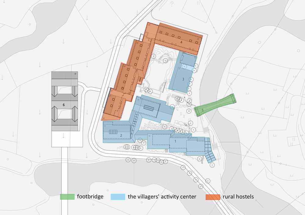 在这样的背景下,2018年ATA设计团队再次对原村委会大院进行改扩建设计:配置乡村旅舍,为游客提供集中住宿服务;设计人行桥,重新规划游客进村流线;补充村民活动中心,力图在改善乡村旅游环境的同时,也进一步复兴乡村公共生活。