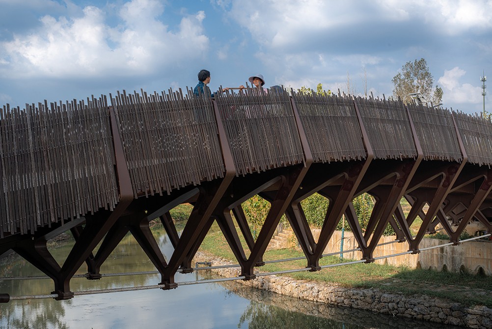两个维度上的曲线变化通过9榀逐渐变化的蝶状腹杆关联在了一起,形成特有的空间变化效果,而桥上的栏板采用不同长短的胶合竹片随即排列的形式,更加突出了人行桥的轻盈感和乡野化。该桥的制作是在距离李巷180公里的张家港的一个造船加工厂完成的,然后通过重型卡车运送至现场后,采用大型汽吊吊装完成。起吊那天,在村民的见证下,施工队像盖房子上主梁一样放了鞭炮祈福。